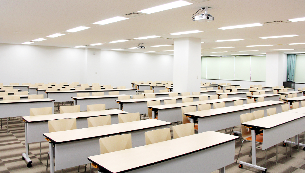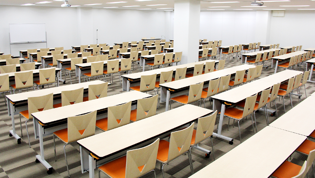 写真奥が実は別の部屋となっており、この部屋にテーブルやチェアを全て格納することが出来るため、400人近く収容できる「大ホール」へと早変わり!!