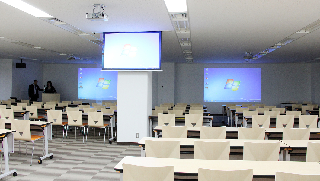 テーブル最大160人/チェア200脚超を収容する会議室となると、正面だけのスクリーン投影ですと後ろの方は見えない場合も。