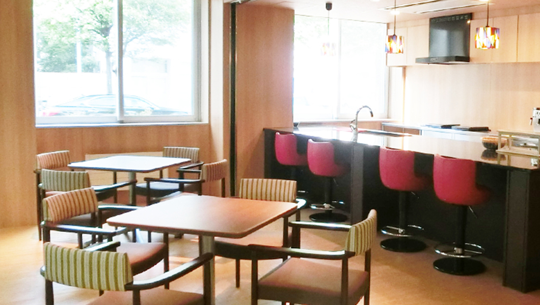 外来患者様や入院患者様のご家族にご利用いただくカフェ。この空間でほんの少しでも元気になってほしいと思いながら。