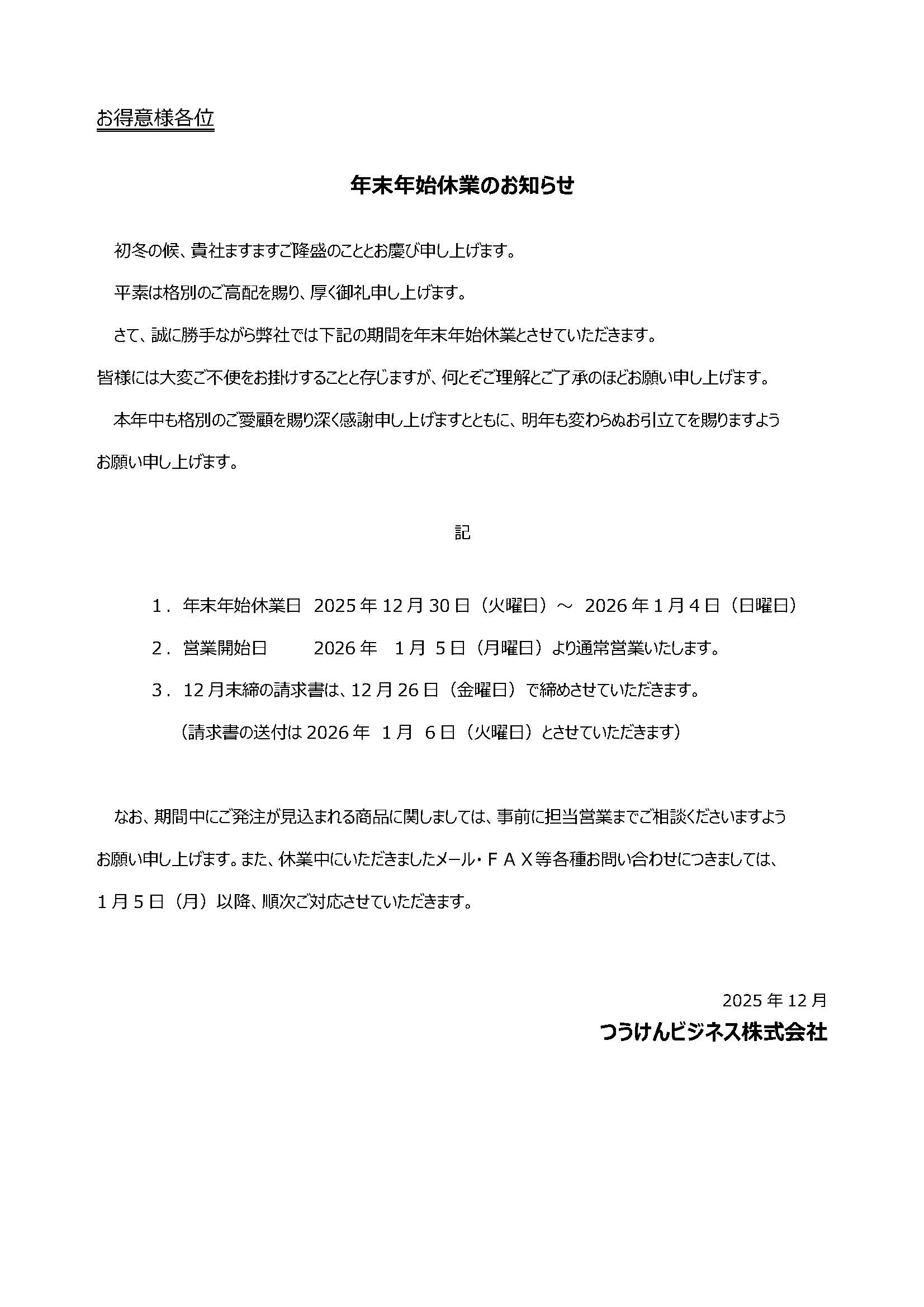 年末年始休業のお知らせ